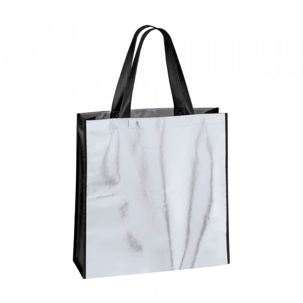 Non-Woven-Tasche aus laminiertem Faservlies (120 g/m2) in Metallic-Ausführung. Tasche in Silber mit Henkeln und Zwickel in einer Vielzahl von kräftigen Farben. Mit 55 cm langen, verstärkten Henkeln sowie verstärktem Zwickel und Steppnähten. Belastbar mit bis zu 9 kg.