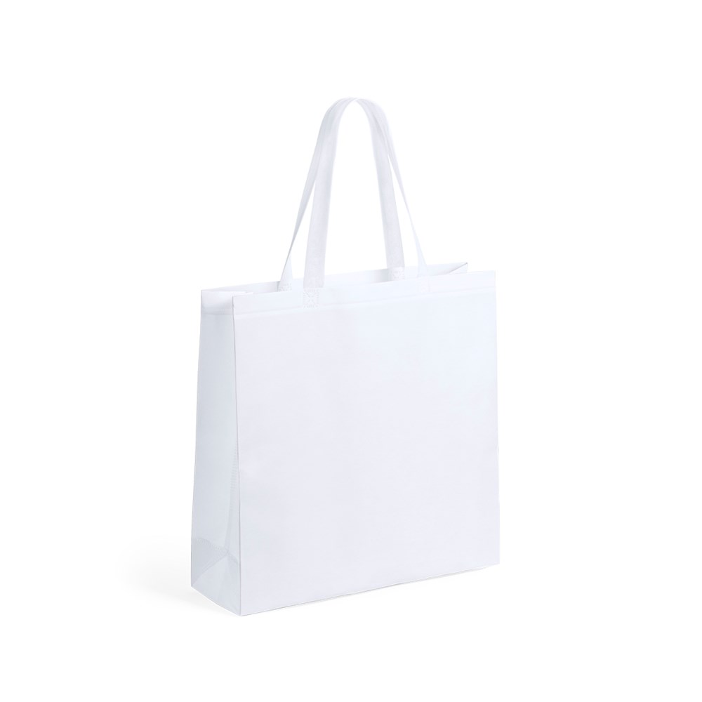 Non-Woven-Tasche aus laminiertem Faservlies (110 g/m2). Tasche und Henkel in Weiß mit Zwickel in verschiedenen kräftigen Farben. Mit 54 cm langen, verstärkten Henkeln und hitzeversiegeltem Finish. Belastbar mit bis zu 9 kg.