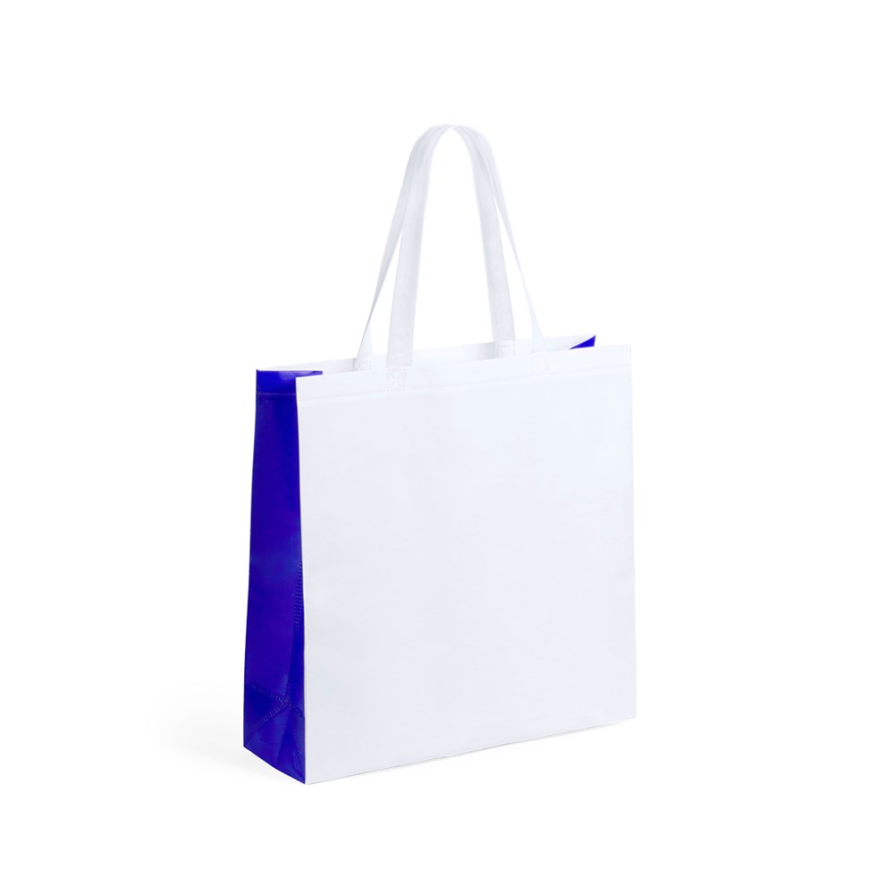 Non-Woven-Tasche aus laminiertem Faservlies (110 g/m2). Tasche und Henkel in Weiß mit Zwickel in verschiedenen kräftigen Farben. Mit 54 cm langen, verstärkten Henkeln und hitzeversiegeltem Finish. Belastbar mit bis zu 9 kg.
