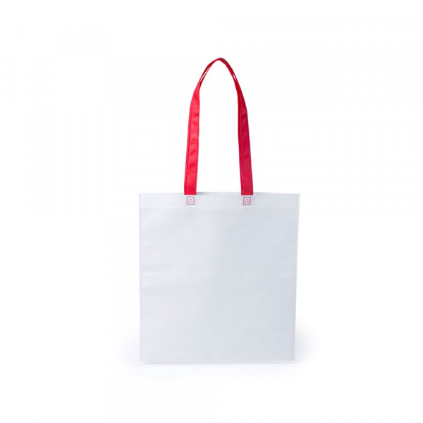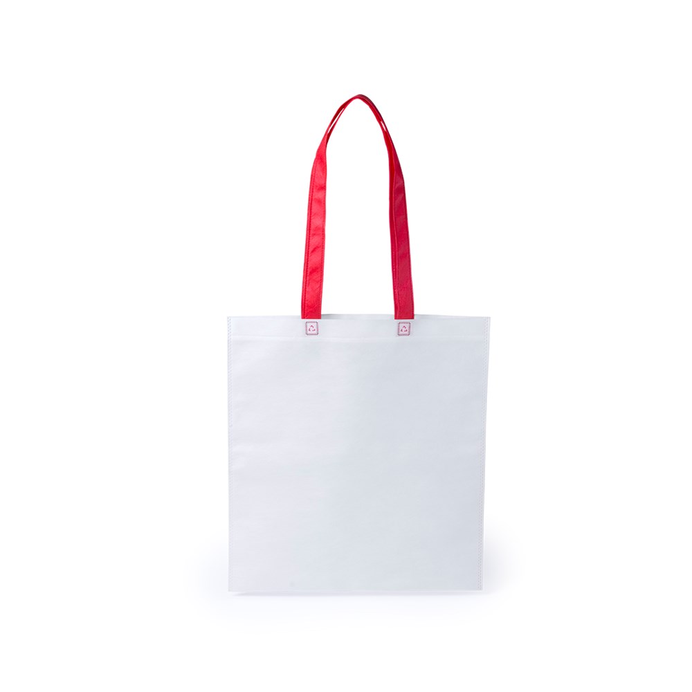 Non-Woven-Tasche aus Faservlies (80 g/m2) in Weiß, mit Henkeln in vielen verschiedenen Farben. Mit hitzeversiegeltem Finish und langen Henkeln mit Recycling-Logo. Belastbar mit bis zu 8 kg.
