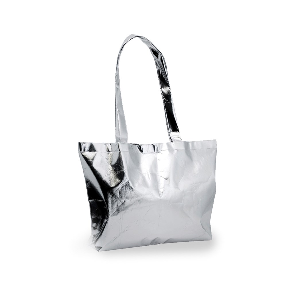 Non-Woven-Tasche aus laminiertem Faservlies (110 g/m2) in Metallic-Ausführung und einer Vielzahl von lebendigen Farben. Mit 55 cm langen, verstärkten Griffen, Zwickel und Steppnähten. Belastbar mit bis zu 9 kg.