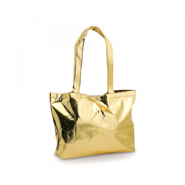 Non-Woven-Tasche aus laminiertem Faservlies (110 g/m2) in Metallic-Ausführung und einer Vielzahl von lebendigen Farben. Mit 55 cm langen, verstärkten Griffen, Zwickel und Steppnähten. Belastbar mit bis zu 9 kg.