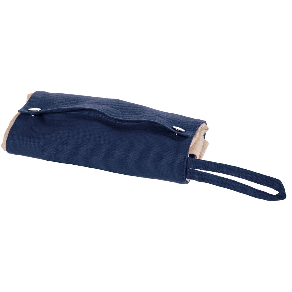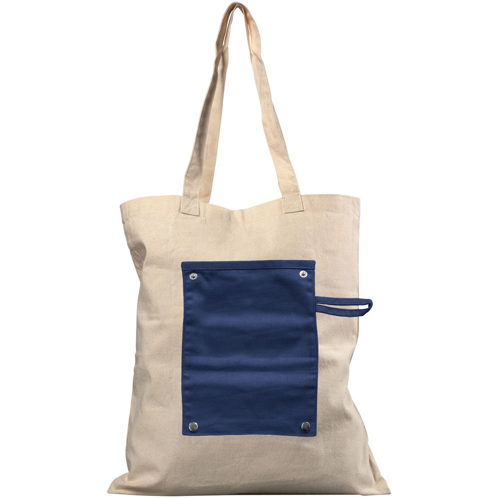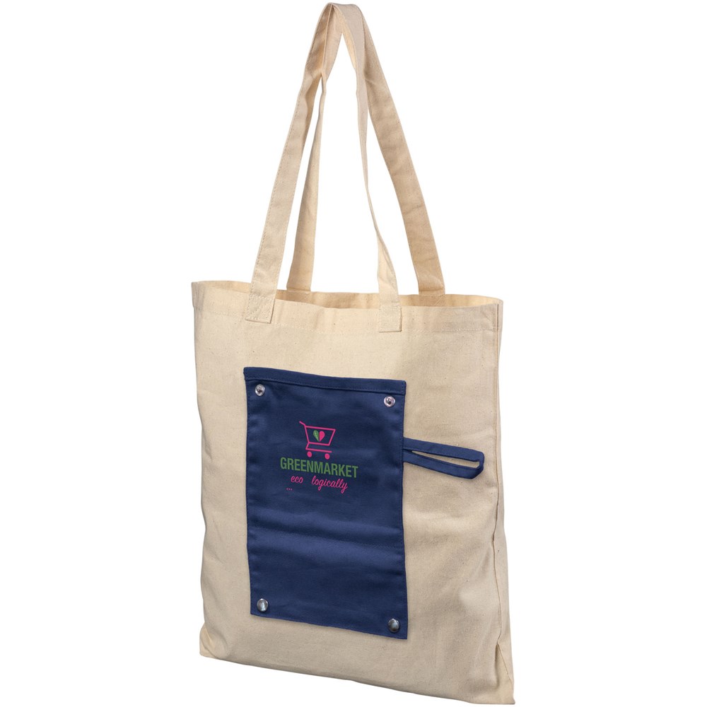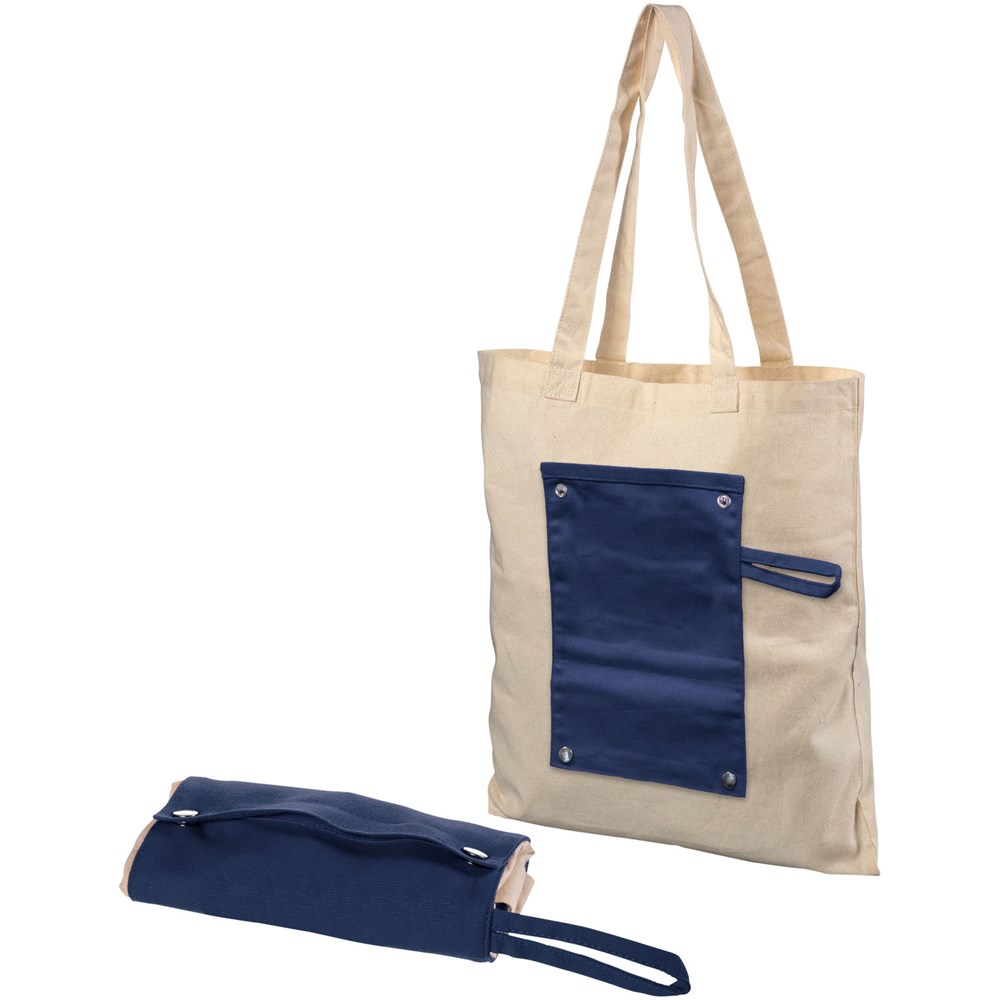 Tragetasche aus 180 g/m² Baumwolle zum Aufrollen mit offenem Hauptfach und praktischem 220 g/m² Teil zum Aufrollen mit Knöpfen. Diese Tasche kann für die Aufbewahrung auf kleinstem Raum problemlos zusammengefaltet werden. 27 cm lange Tragegriffe.