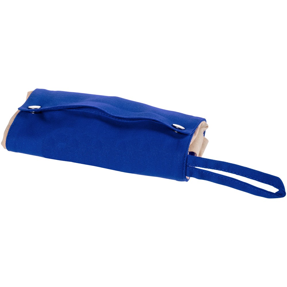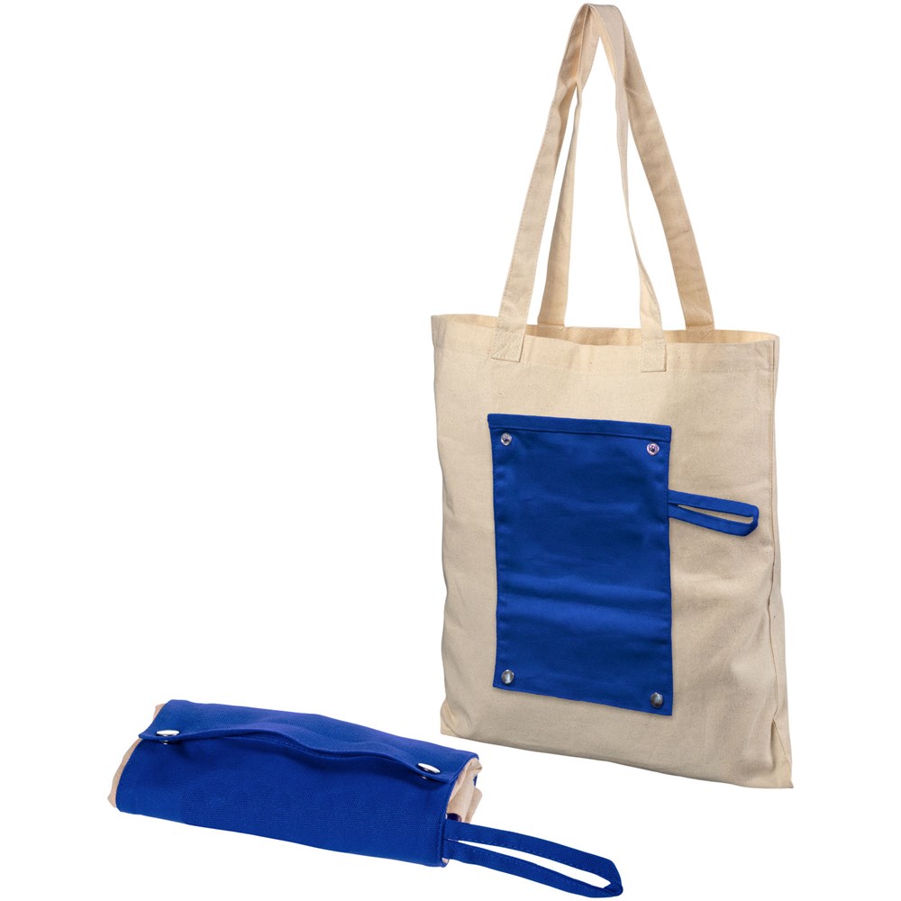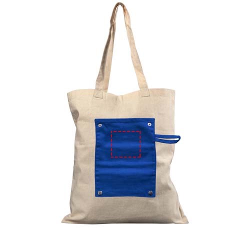 Tragetasche aus 180 g/m² Baumwolle zum Aufrollen mit offenem Hauptfach und praktischem 220 g/m² Teil zum Aufrollen mit Knöpfen. Diese Tasche kann für die Aufbewahrung auf kleinstem Raum problemlos zusammengefaltet werden. 27 cm lange Tragegriffe.