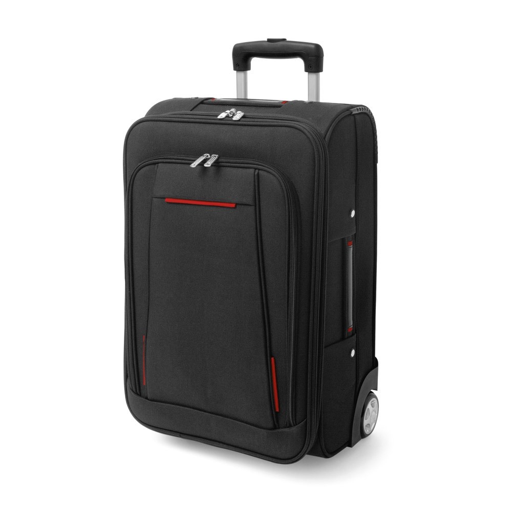 Trolley aus 600D und EVA mit halbstarrer Vordertasche und gefüttertem Innenraum. Auf der Rückseite befindet sich ein Identifikationsetikett. Dieser Trolley hat einen ausziehbaren Teleskopgriff aus Aluminium mit Fede, eine Kapazität bis zu 28 L und ein Gewicht von 2.95 kg. 345 x 520 x 195 mm