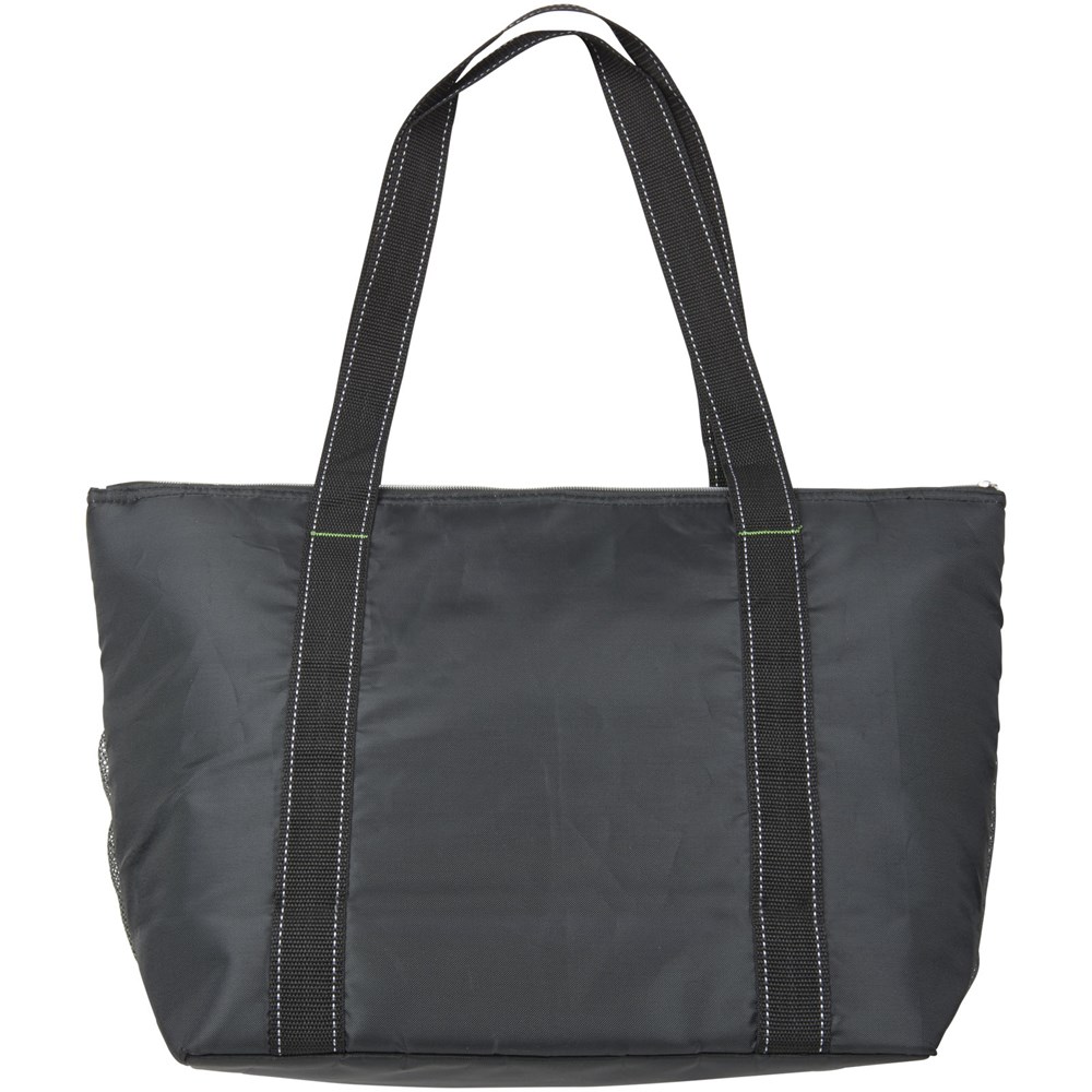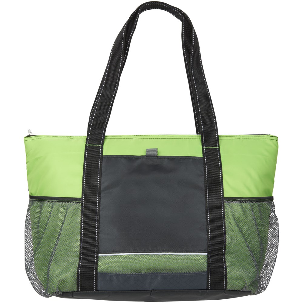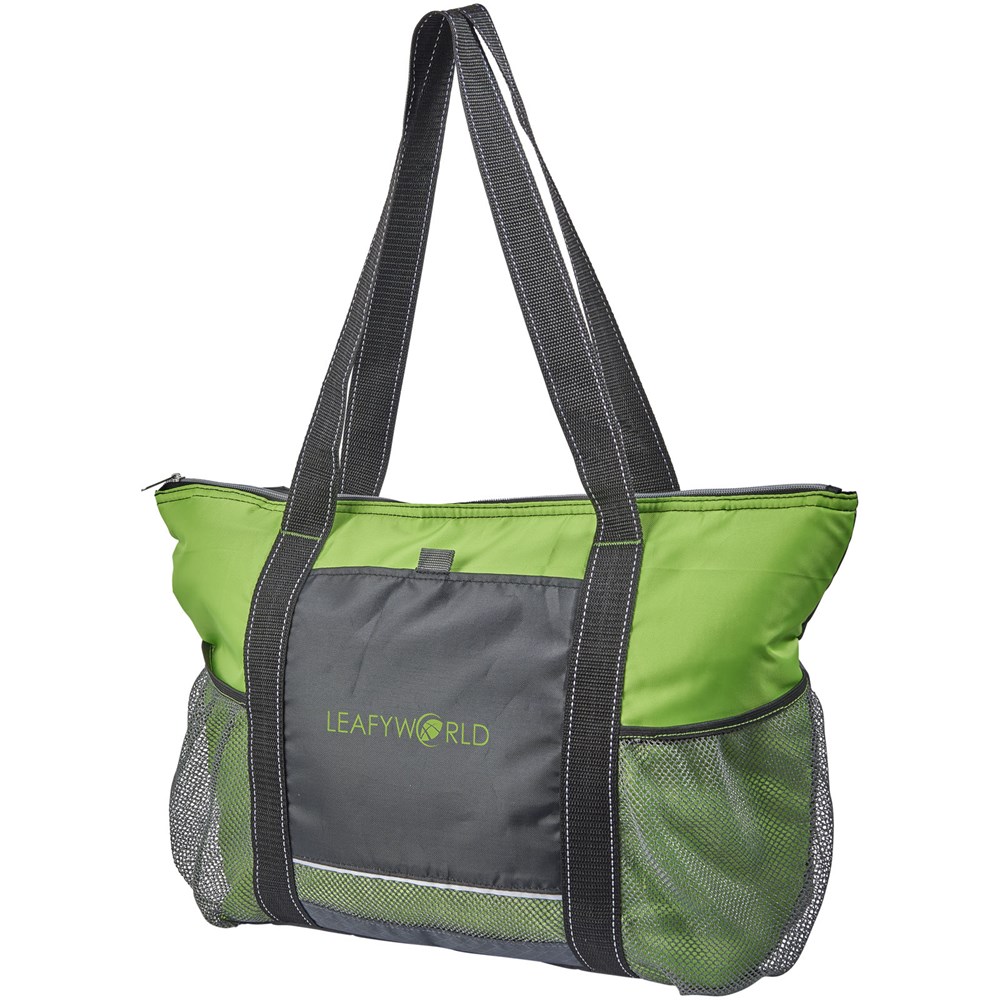 Reißverschluss-Hauptfach mit heißversiegeltem PEVA-Innenfutter und verstärktem Boden. Fronttasche und zwei Seitentaschen. Schulterlange Griffe mit einer Tragegriffhöhe 30 cm. Diese Kühltasche mit einer Kapazität für 30 Dosen, hat auch eine vordere Schlaufe für Schlüssel.