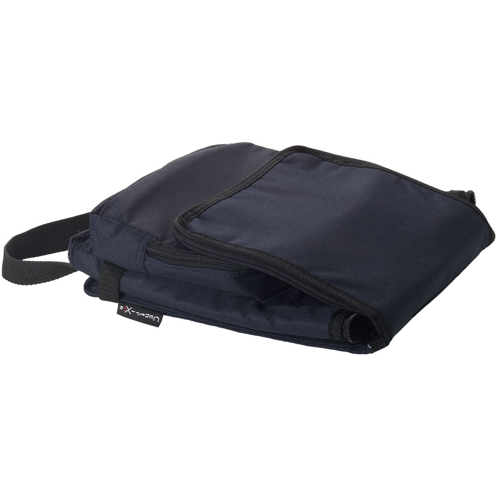Zusammenfaltbare Kühltasche mit Hauptfach mit Reißverschluss und Fronttasche mit Reißverschluss. Verstellbarer Schulterriemen. Die Kühltasche kann dank des Klettverschlusses an der Fronttasche flach zusammengefaltet werden.