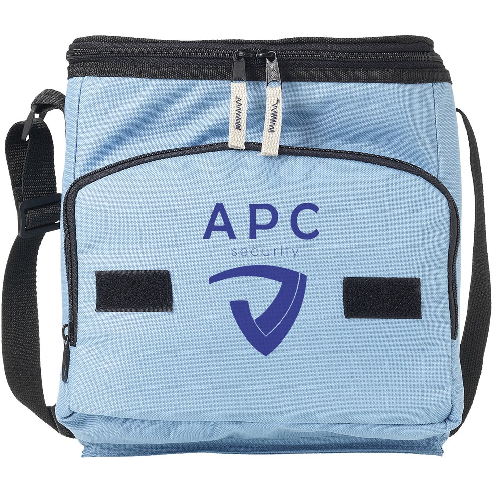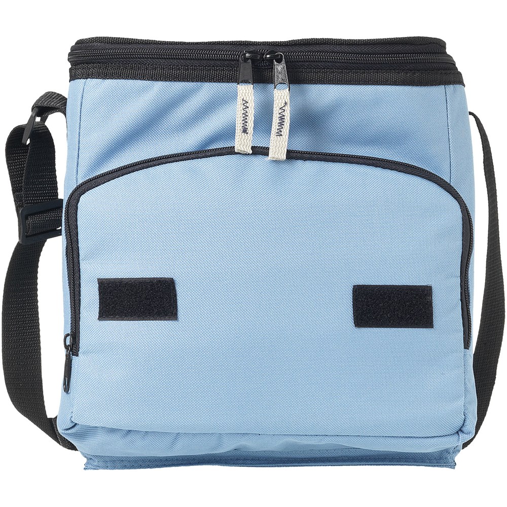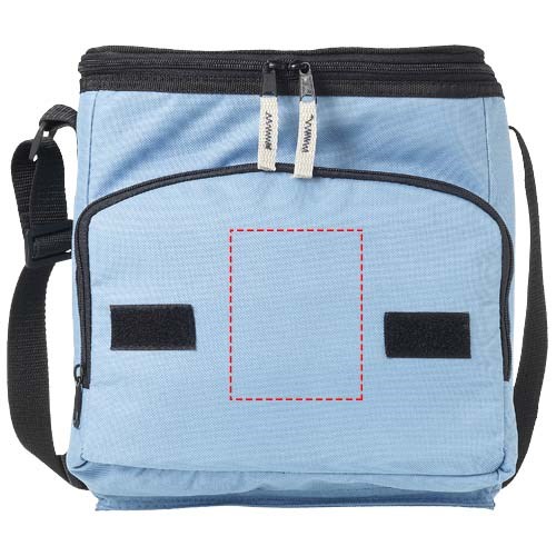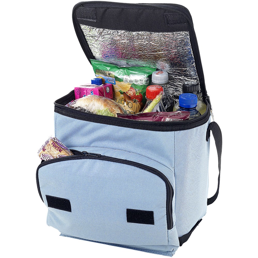 Zusammenfaltbare Kühltasche mit Hauptfach mit Reißverschluss und Fronttasche mit Reißverschluss. Verstellbarer Schulterriemen. Die Kühltasche kann dank des Klettverschlusses an der Fronttasche flach zusammengefaltet werden.
