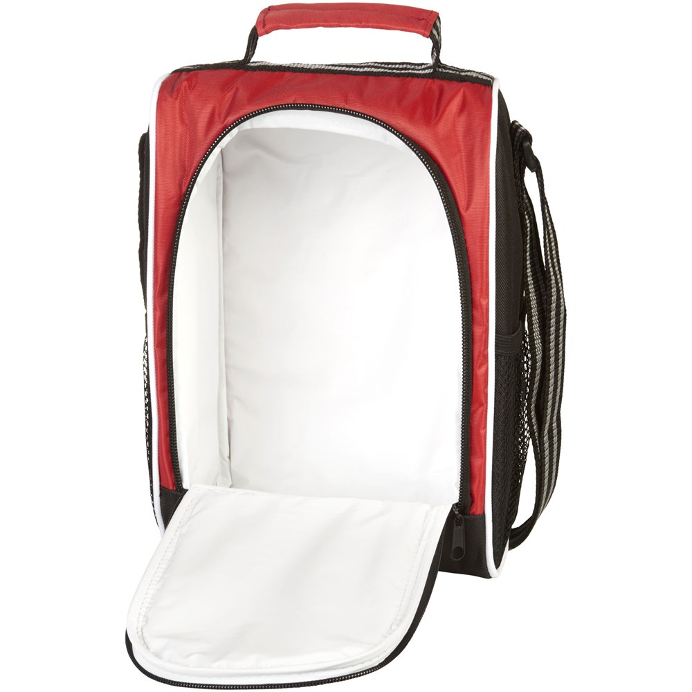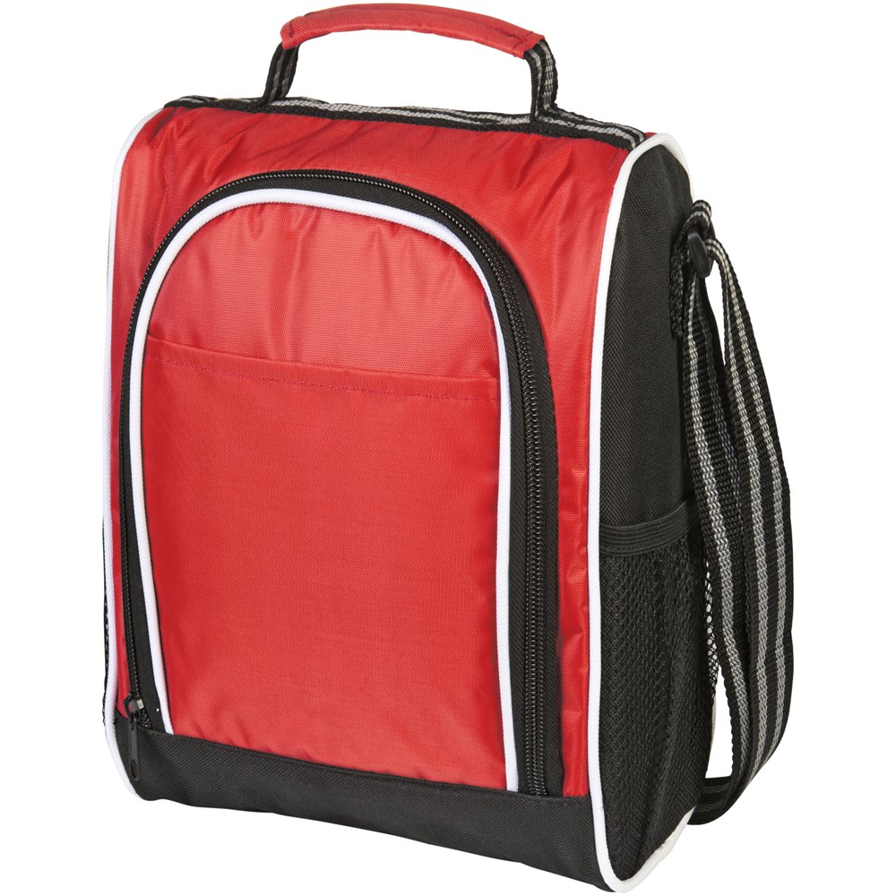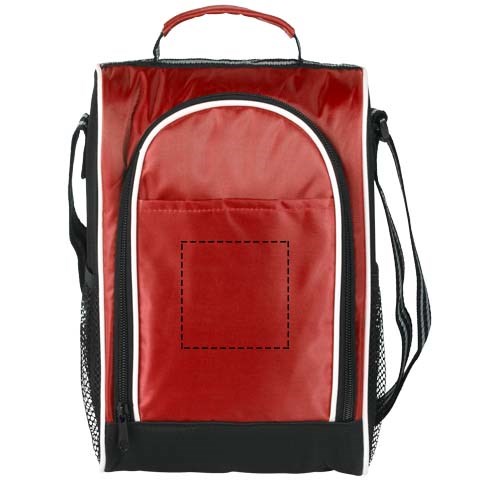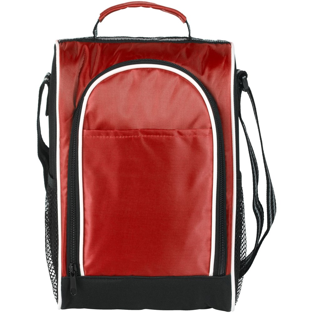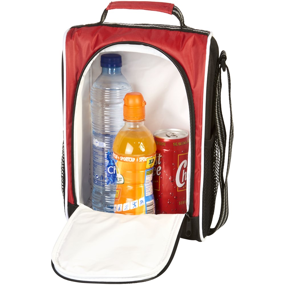 Eine praktische und haltbare Lunchtasche mit isoliertem Hauptfach mit Reißverschluss und Netztaschen an den Seiten. Sie verfügt außerdem über einen kurzen Tragegriff und einen praktischen einstellbaren Schulterriemen.