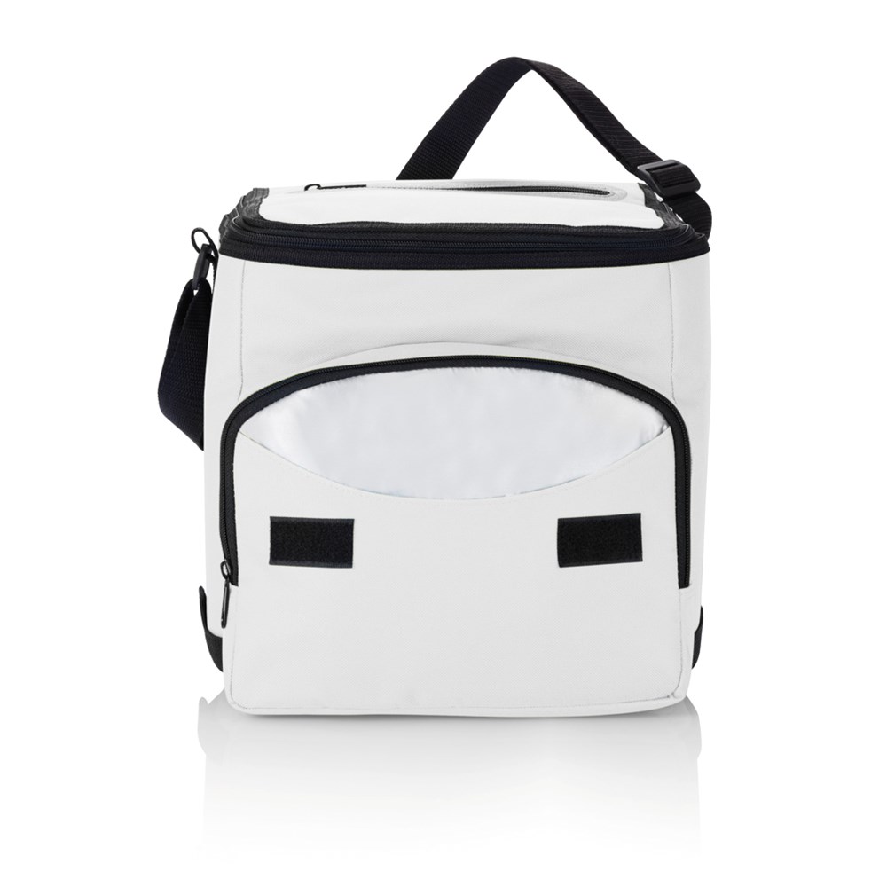 600D Kühltasche mit silberner Innenseite damit Essen und Getränke frisch und gekühlt bleiben. Auf der Vorderseite befindet sich noch eine weitere Tasche mit farbigen Details, die mit einem Reißverschluss geschlossen wird für alle anderen Kleinigkeiten.