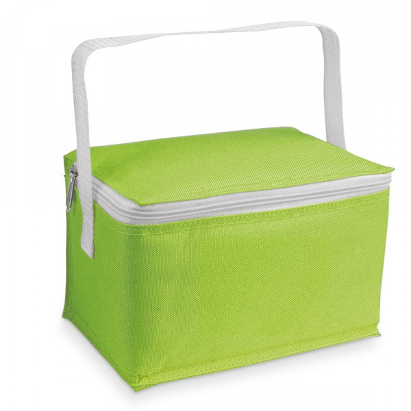 Kühltasche aus 600D mit Tragegriff. Kapazität bis zu 6 Dosen (je ,0'33 L) und bis zu 3 Liter. Erhältlich in verschiedenen Farben. 200 x 140 x 125 mm
