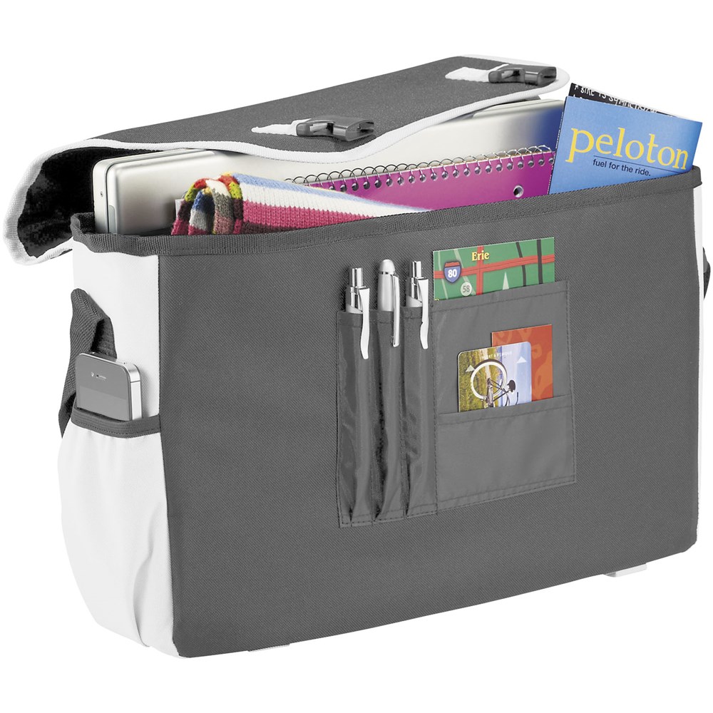 Laptop Schultertasche für einen 15,6" Laptop plus iPad/Tablet in einem speziellen Fach. Großes Hauptfach. Luxus Einteilung unter der Klappe. Reißverschlussfach für zusätzlichen Stauraum vorne. Elastische Tasche für Getränke an der Seite. Gepolsterter Boden. Verstellbarer Schulterriemen.