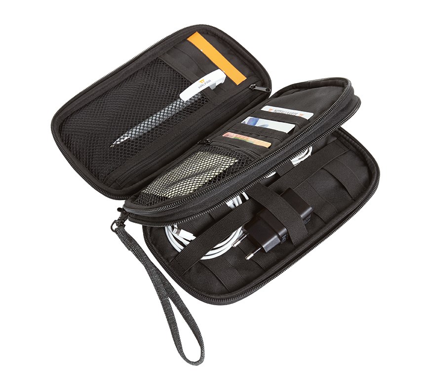 Organizer-Mappe mit zwei Reißverschluss-Hauptfächern; abnehmbare Tragelasche; diverse Reißverschluss- und Netztaschen; diverse Einsteckfächer; elastisches Befestigungsraster