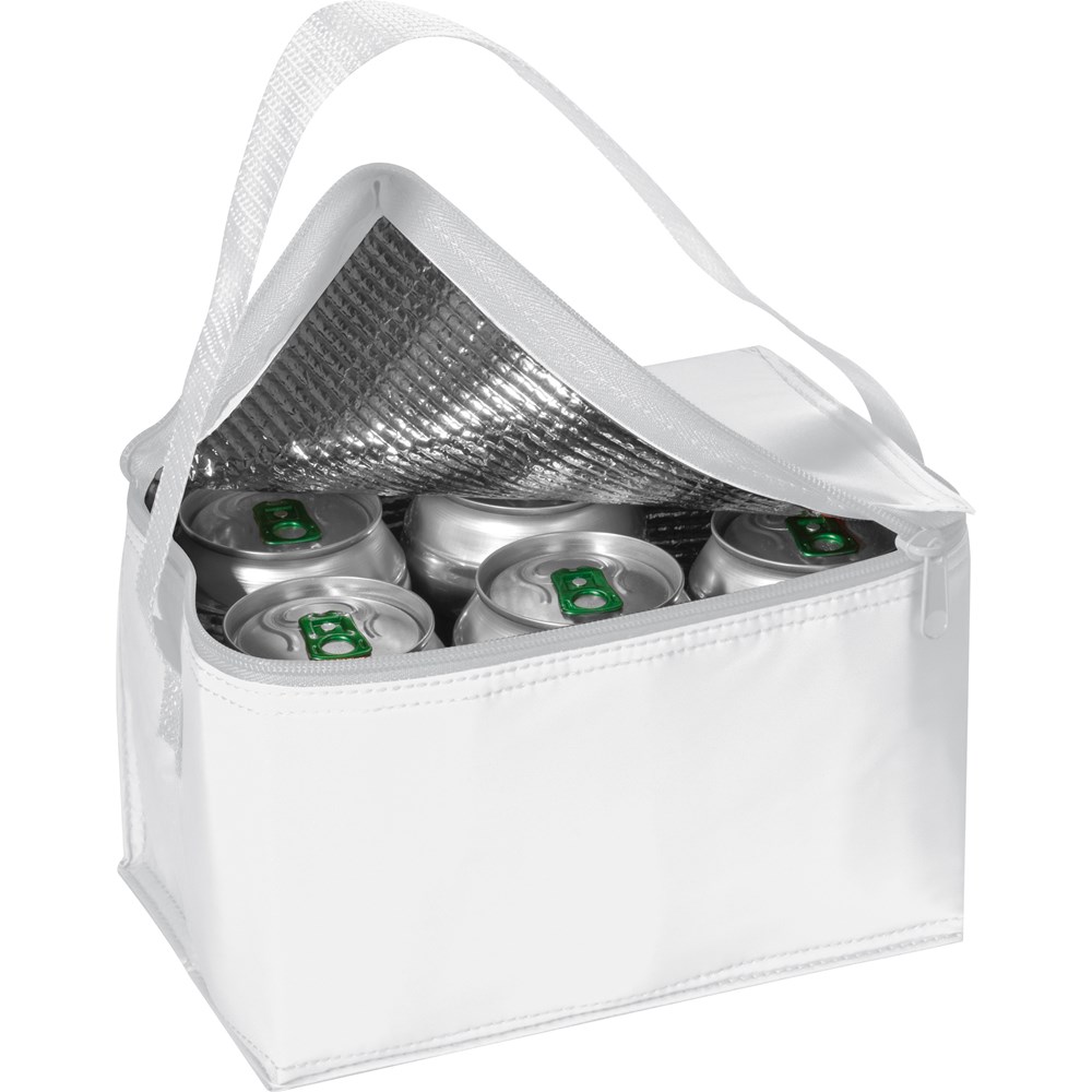Einfache Kühltasche aus Polyester, passend für 6 Getränkedosen (0,33 Liter) mit Trageschlaufe. Ihre Werbung drucken wir oben auf den Deckel mittig.