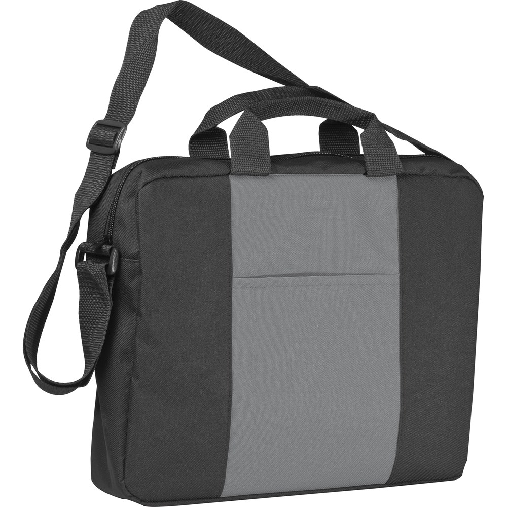 Umhängetasche aus 600D Polyester mit zwei Tragegriffen, einem verstellbaren Schultergurt und einem Steckfach, das vorne im farbigem Streifen eingenäht ist. Ihre Werbung drucken wir auf den breiten Streifen.