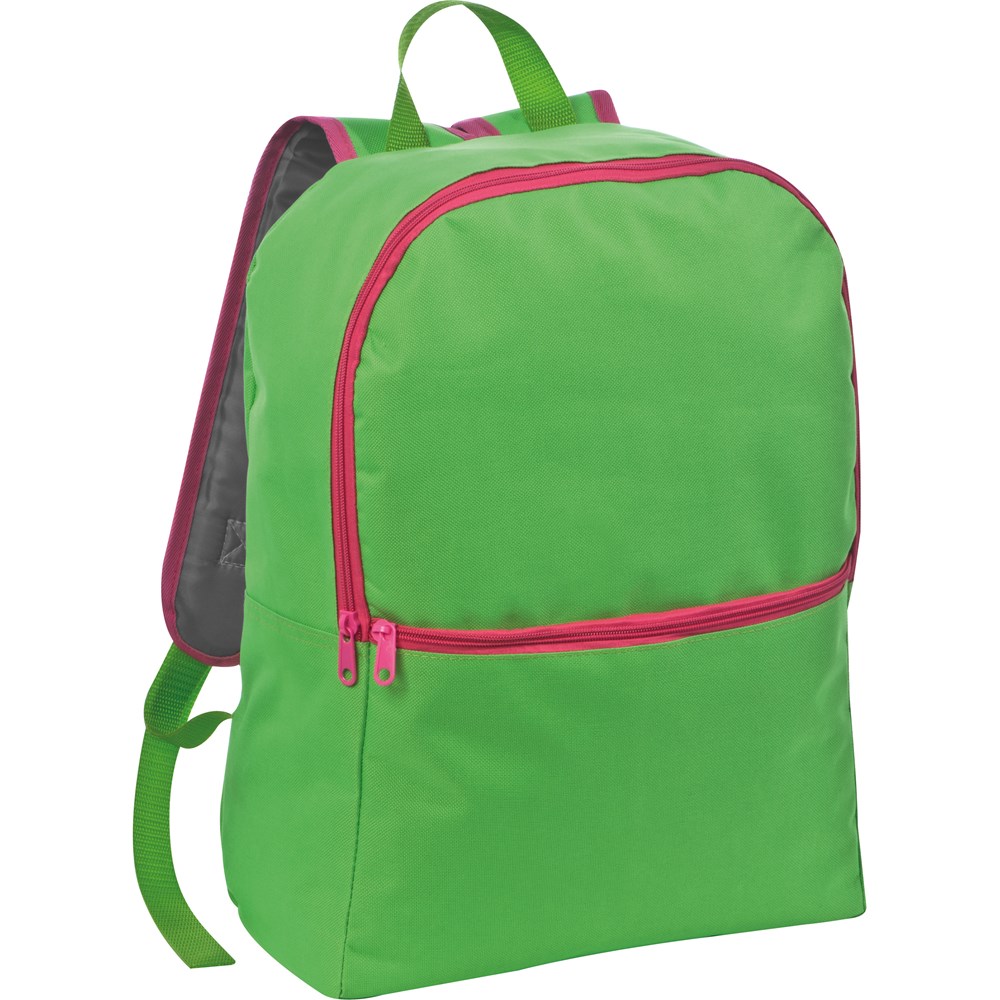 Rucksack aus Polyester in knalligen Farben, der Reißverschluss ist farbig abgesetzt und die Schultergurte gepolstert. Ihre Werbung drucken wir auf das Vorfach.