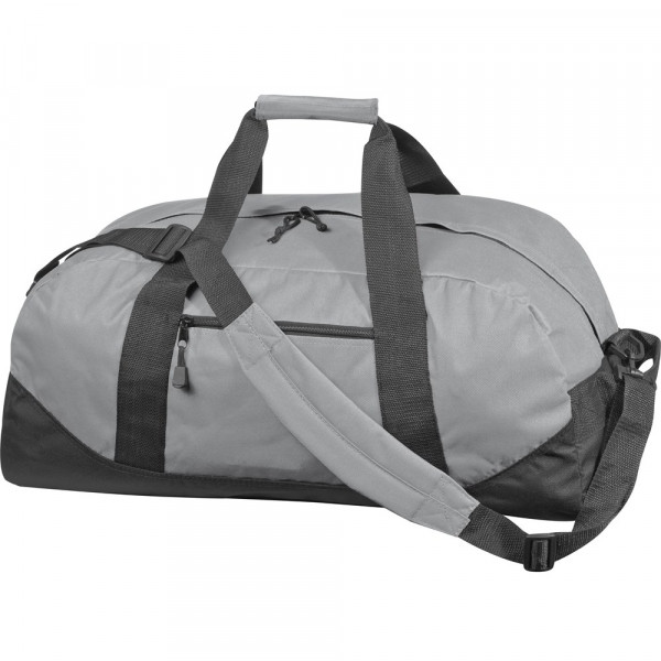 Geräumige Sport- oder Reisetasche aus 600D Polyester mit weich gepolstertem Schultergurt und Vorfach mit Reißverschluss. Ihre Werbung drucken wir zentriert auf die Vortasche zwischen den schwarzen Streifen.