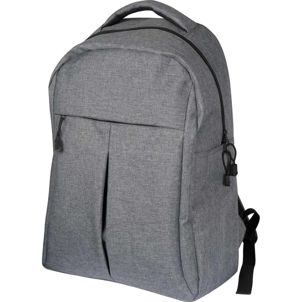 Rucksack aus 600D Polyester mit schwarzen Reißverschlüssen und Vorfach. Das Hauptfach eignet sich ideal zum Transport und der Aufbewahrung von Laptops oder Notebooks. Ihre Werbung wird auf das Vorfach gedruckt.