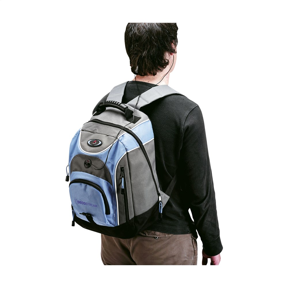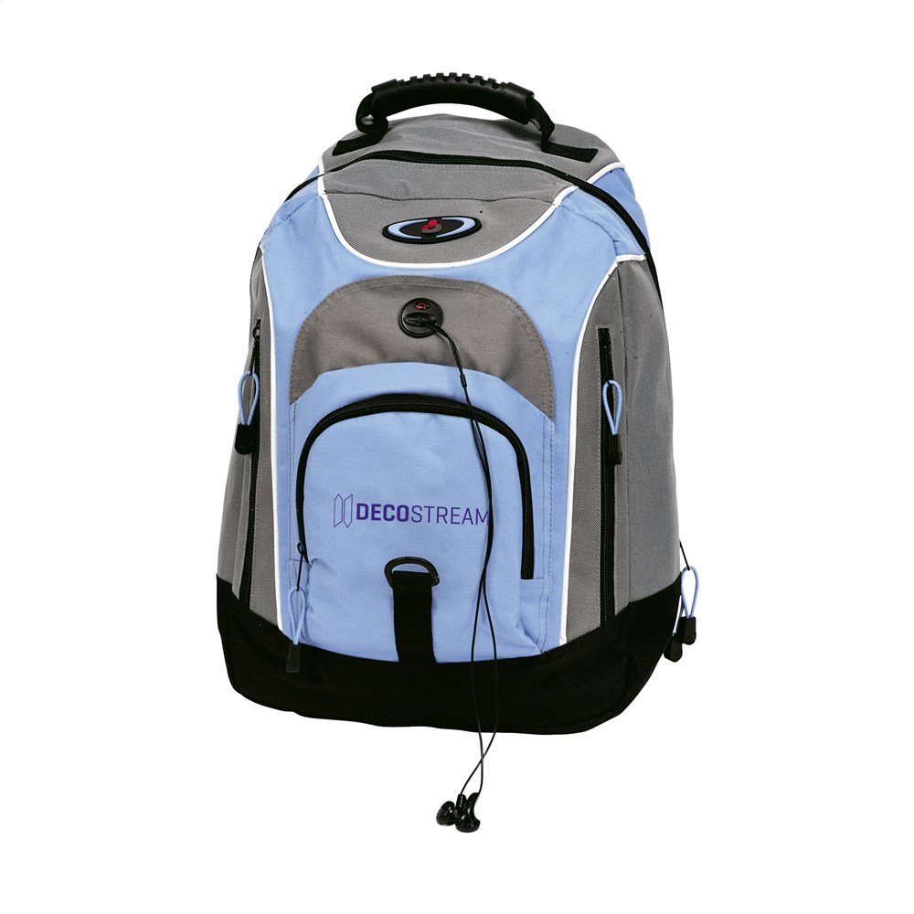 Sportlicher Rucksack aus 600D Polyester mit verstellbaren, wattierten Seiten, wattierter Rückseite und Schulterriemen, Nylonreißverschlüssen und einer Öffnung für Kopfhörer.