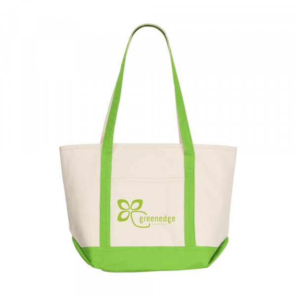Wunderschöne Einkaufs- und Strandtasche aus robustem Canvas (390 g/m²). Breites und zeitloses Modell mit langen Griffen und Einsteckfach auf der Vorderseite. Natürlich mit auffallenden Farbakzenten.