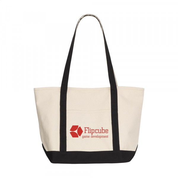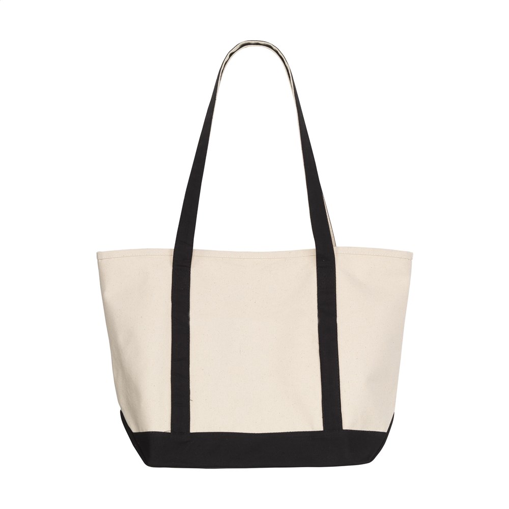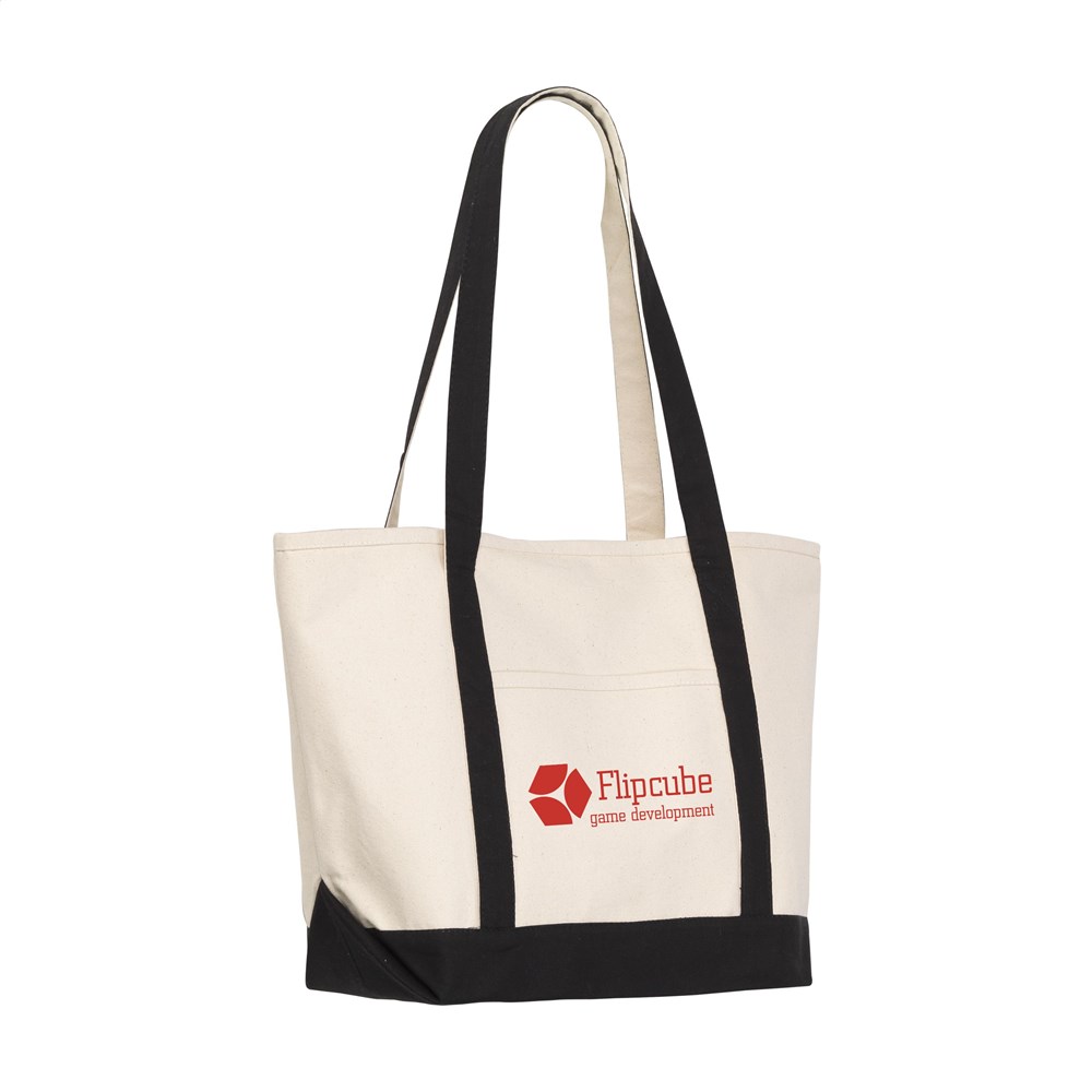 Wunderschöne Einkaufs- und Strandtasche aus robustem Canvas (390 g/m²). Breites und zeitloses Modell mit langen Griffen und Einsteckfach auf der Vorderseite. Natürlich mit auffallenden Farbakzenten.