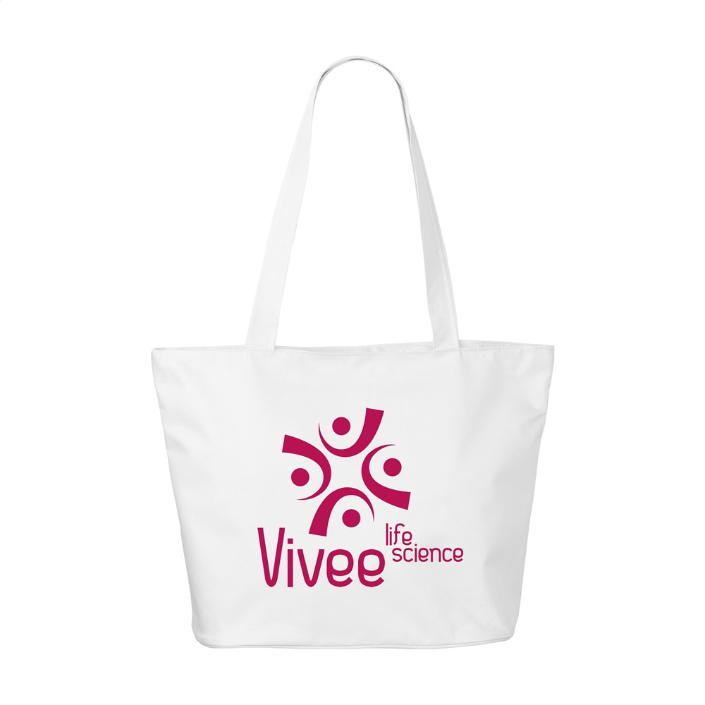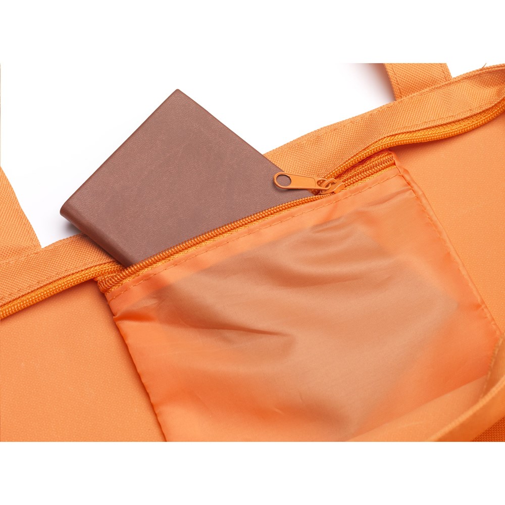 Schöne, robuste Tasche aus 600D-Polyester mit verstärkter Innenseite, langen Henkeln, Reißverschluss und Aufbewahrungsfach mit Reißverschluss. Der breite Boden ist außen schön und stramm mit einem runden Zierstreifen veredelt. Multifunktional einsetzbar als Shopper, Einkaufstasche und Strandtasche.