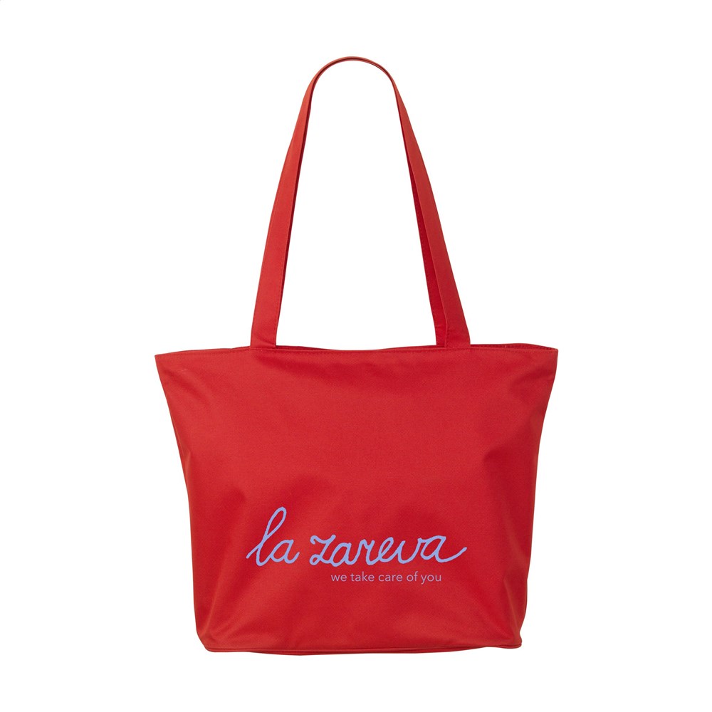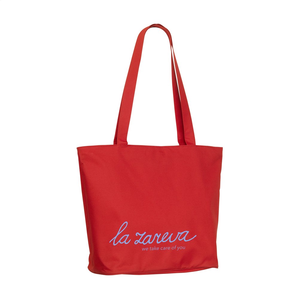 Schöne, robuste Tasche aus 600D-Polyester mit verstärkter Innenseite, langen Henkeln, Reißverschluss und Aufbewahrungsfach mit Reißverschluss. Der breite Boden ist außen schön und stramm mit einem runden Zierstreifen veredelt. Multifunktional einsetzbar als Shopper, Einkaufstasche und Strandtasche.
