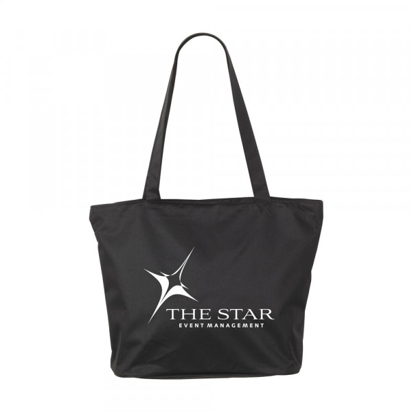 Schöne, robuste Tasche aus 600D-Polyester mit verstärkter Innenseite, langen Henkeln, Reißverschluss und Aufbewahrungsfach mit Reißverschluss. Der breite Boden ist außen schön und stramm mit einem runden Zierstreifen veredelt. Multifunktional einsetzbar als Shopper, Einkaufstasche und Strandtasche.