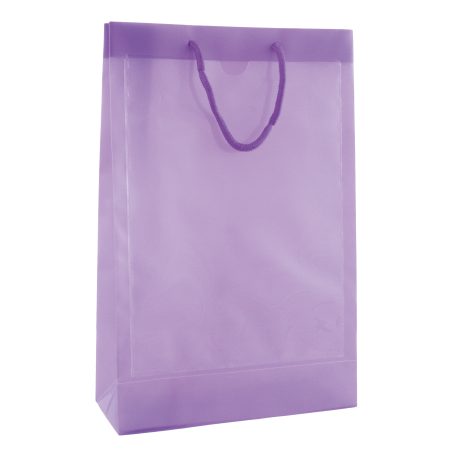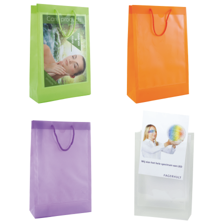 Tragetasche transparent mit 2 Fenstern A4 Inlay, 260 x 400 x 100 mm, mit Kordeln: 5 x 150 mm, Aus recyclebarem Polypropylen.