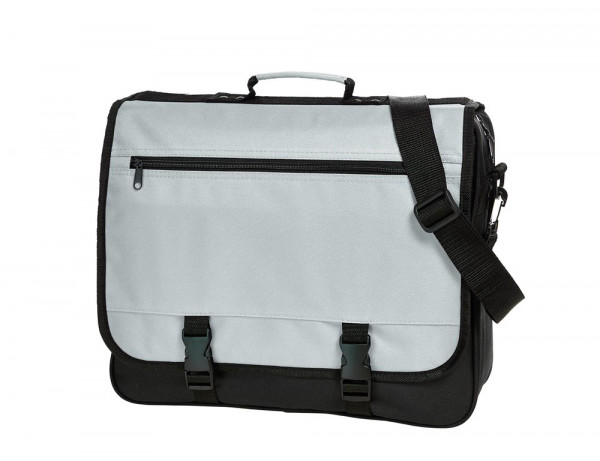 Reißverschluss-Hauptfach mit flacher Vortasche und Organizer-Elementen (4 Stiftschlaufen, Visitenkarteneinsteckfach); rückseitiges, flaches Einsteckfach mit Druckknopf; Überschlag mit Steckschnallen; Reißverschluss-Vortasche; Handgriff; längenverstellbarer, abnehmbarer Umhängegurt