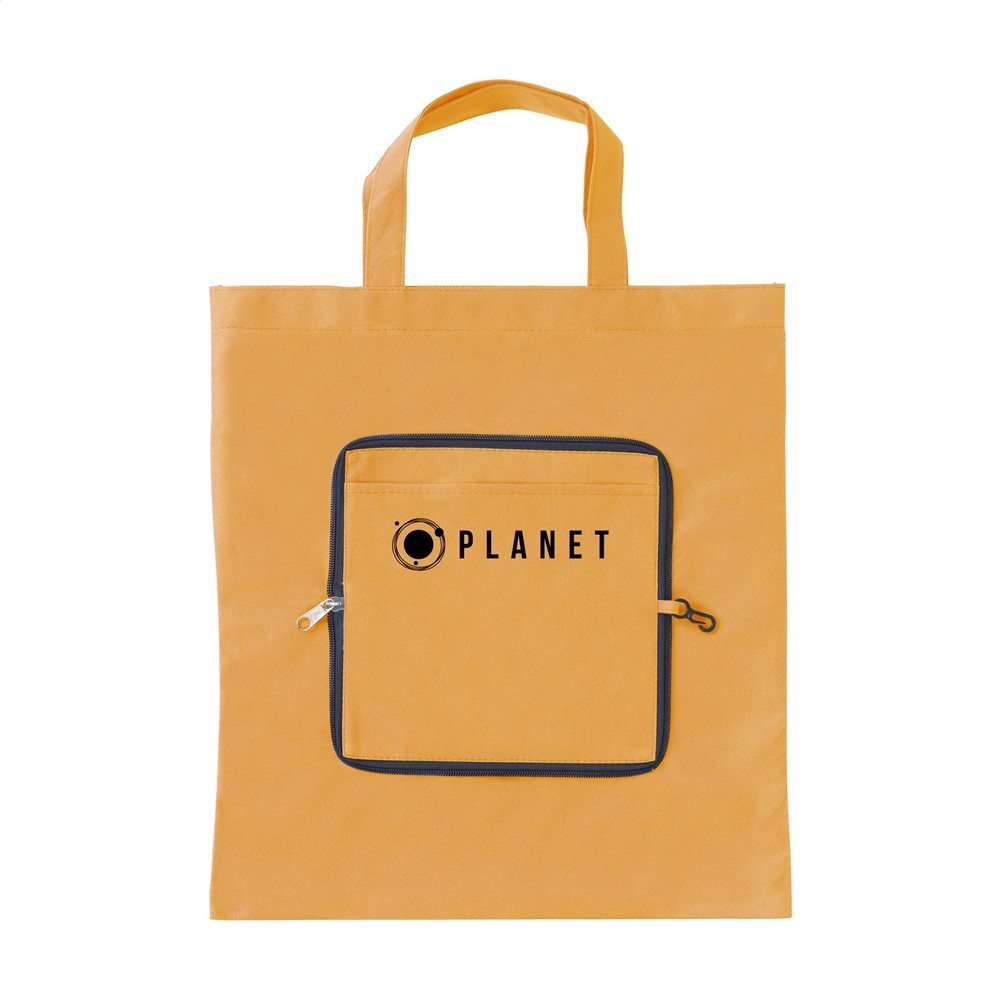 Faltbare Einkaufstasche aus Vlies (80g/m²) mit Einsteckfächern. In einem handlichen Etui mit Reißverschluss und Karabinerhaken. Maße ausgefaltet: 37 x 40 cm.