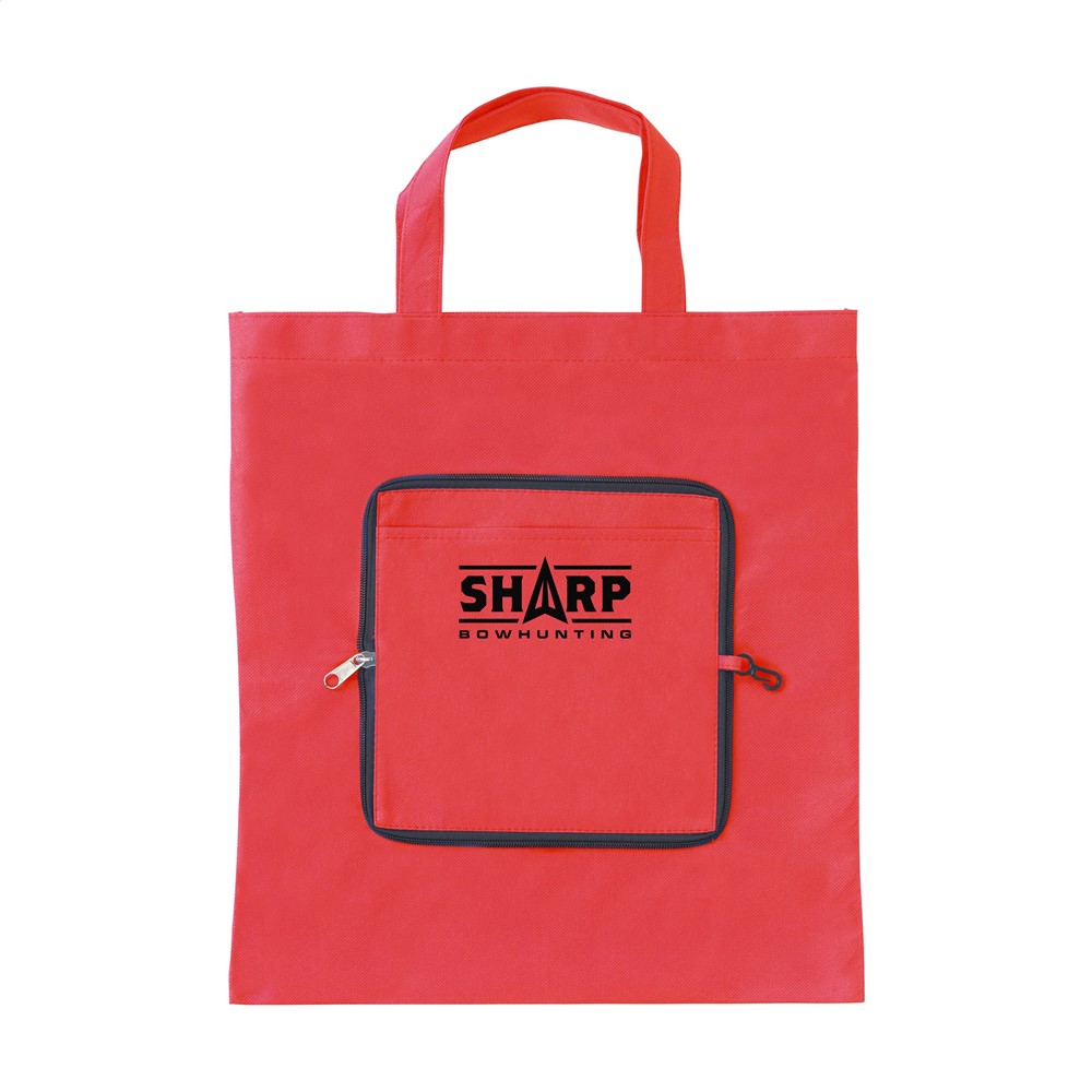 Faltbare Einkaufstasche aus Vlies (80g/m²) mit Einsteckfächern. In einem handlichen Etui mit Reißverschluss und Karabinerhaken. Maße ausgefaltet: 37 x 40 cm.