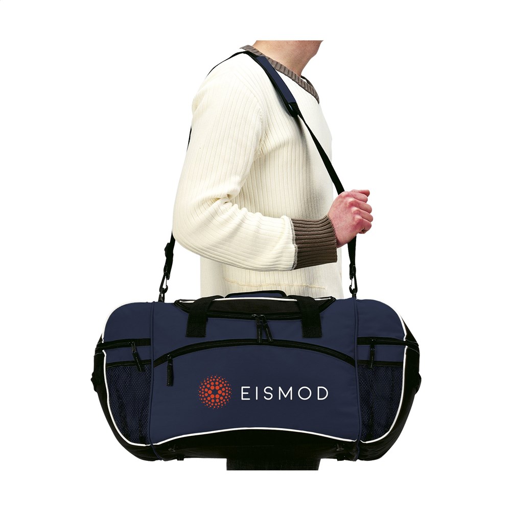 Geräumige Sporttasche aus 600D Polyester mit verstellbarem/abnehmbarem Schulterriemen, mehreren Fächern, 2 Handgriffen, Einlegeboden und Bodennoppen. Fassungsvermögen: ca. 29 Liter.