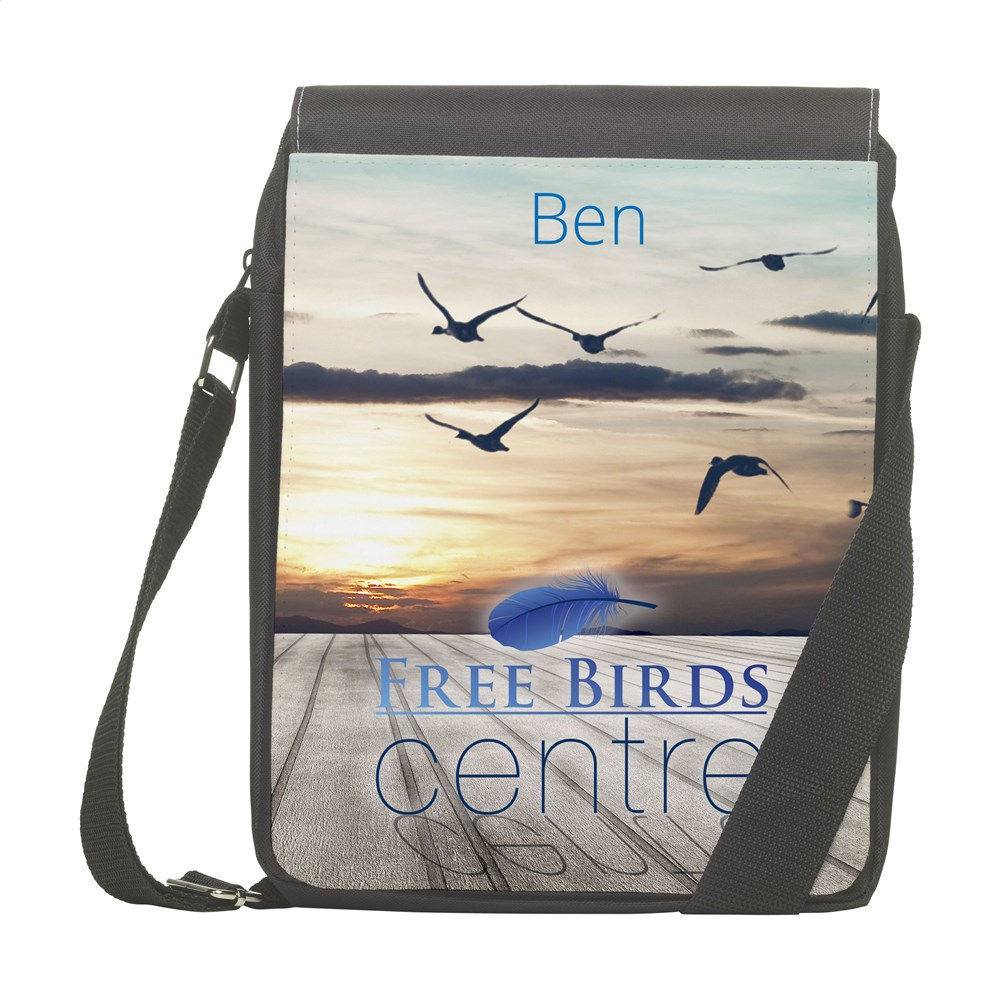 Schulter-/Dokumententasche aus festem 600D-Polyestergewebe. Mit großem Hauptfach, Schaumstofffach mit Klettverschluss für Tablets mit einer Größe von bis zu 10", Fronttasche mit Reißverschluss und verstellbarem Schulterriemen. Der abnehmbare Überschlag kann vollflächig mit einem einzigartigen Design, individueller Farbe oder einem Foto in Vollfarbe bedruckt werden.