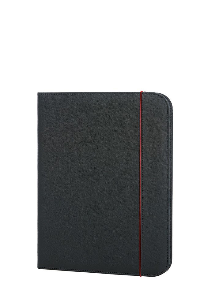 schwarze Schreibmappe mit Organizer-Elementen; verschließbar mit farbigem Gummiband; inkl. Schreibblock; flaches Einsteckfach; Gummischlaufe für Kugelschreiber