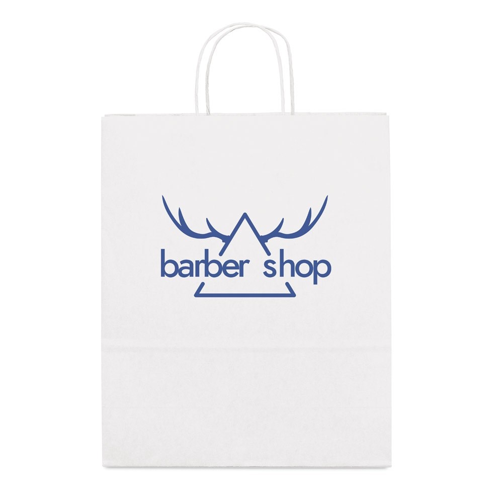 Tragetasche aus Kraftpapier (100 g/m²) mit gedrehten Henkeln aus Papier. 320 x 390 x 110 mm