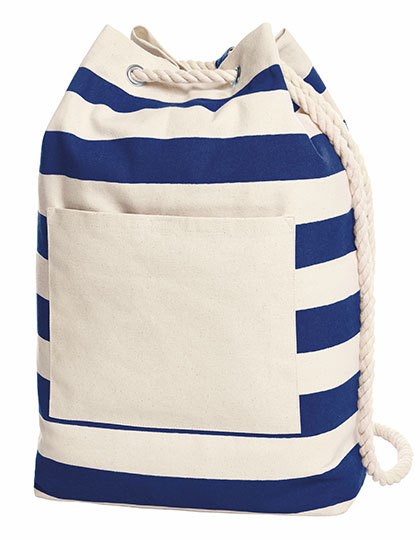 Junger Rucksack mit frischem Blockstreifen-Dekor | Großzügiger Schnitt mit geradem Rücken | Große Vortasche mit Klettverschluss | Dekorative Ösen und Träger aus dicker Baumwollkordel | Lieferung ohne Inhalt/Deko