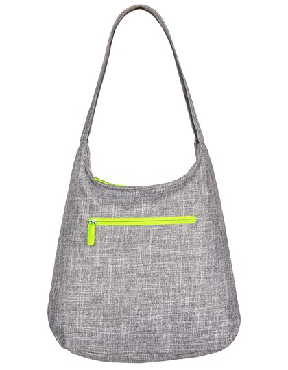600D Polyester City-Shopper in Grey Melange | Ein geräumiges Hauptfach mit neonfarbigem Reißverschluss | Eine kleine Reißverschluss-Tasche auf der Vorderseite | Lange Trageschlaufe, auch als Schulterriemen zu benutzen | Alle Reißverschlüsse in Neonfarbe mit neonfarbigem Gummi-Zipp-Puller mit „bags2GO“-Prägung | Volumen: ca. 20 Liter | Lieferung ohne Inhalt/Deko