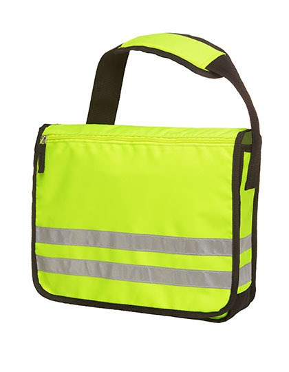 Großes Hauptfach | Flaches Einsteckfach mit Organizer-Elementen | Reißverschluss-Tasche auf dem Überschlag | Längenverstellbarer Schultergurt mit genähtem Schulterpolster | Leuchtend neongelbes Hauptmaterial mit 3M® Reflektions-Streifen | Lieferung ohne Inhalt/Deko