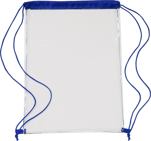 Turnbeutel aus PVC, transparent, mit farbigen Applikationen und Schultergurten aus Kordeln.