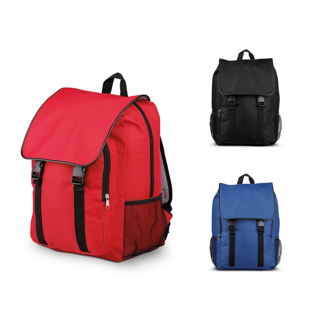 Rucksack aus 600D mit einem Hauptfach, einer Vordertasche und 2 Mesh-Seitentaschen. Dieser Rucksack hat eine Kapazität von 24 l. 280 x 390 x 220 mm