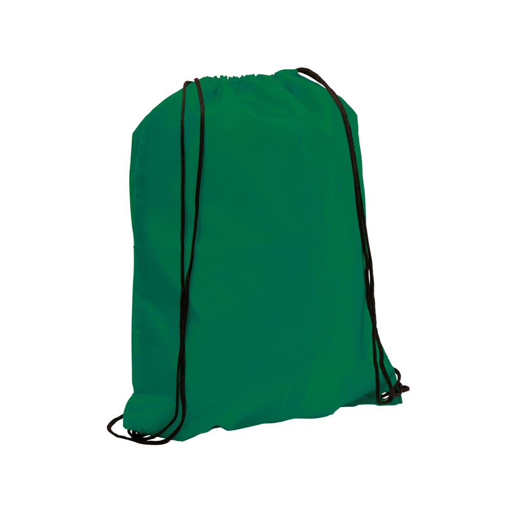 Rucksack mit Kordelzug aus weichem 210T Polyester in einer Vielzahl von lebendigen Farben. Mit schwarzen Zugbändern und Ecken mit Metallösen mit farblich passender Kunstlederverstärkung.