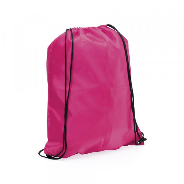 Rucksack mit Kordelzug aus weichem 210T Polyester in einer Vielzahl von lebendigen Farben. Mit schwarzen Zugbändern und Ecken mit Metallösen mit farblich passender Kunstlederverstärkung.