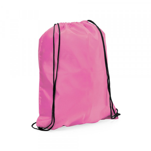 Rucksack mit Kordelzug aus weichem 210T Polyester in einer Vielzahl von lebendigen Farben. Mit schwarzen Zugbändern und Ecken mit Metallösen mit farblich passender Kunstlederverstärkung.