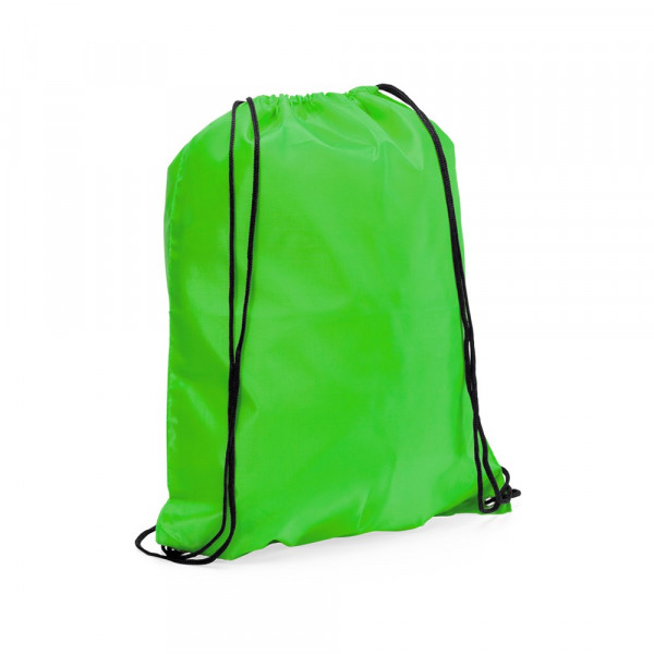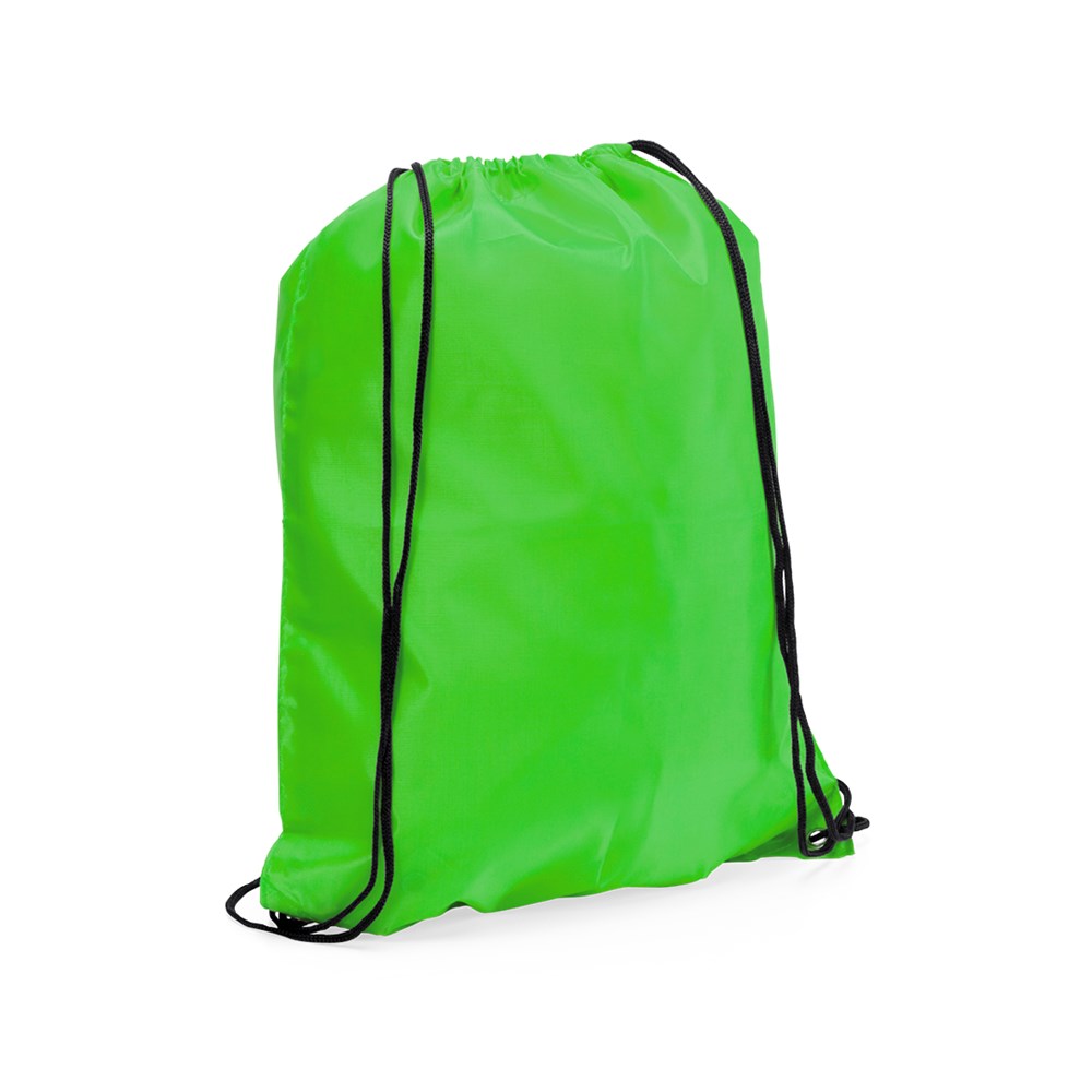 Rucksack mit Kordelzug aus weichem 210T Polyester in einer Vielzahl von lebendigen Farben. Mit schwarzen Zugbändern und Ecken mit Metallösen mit farblich passender Kunstlederverstärkung.