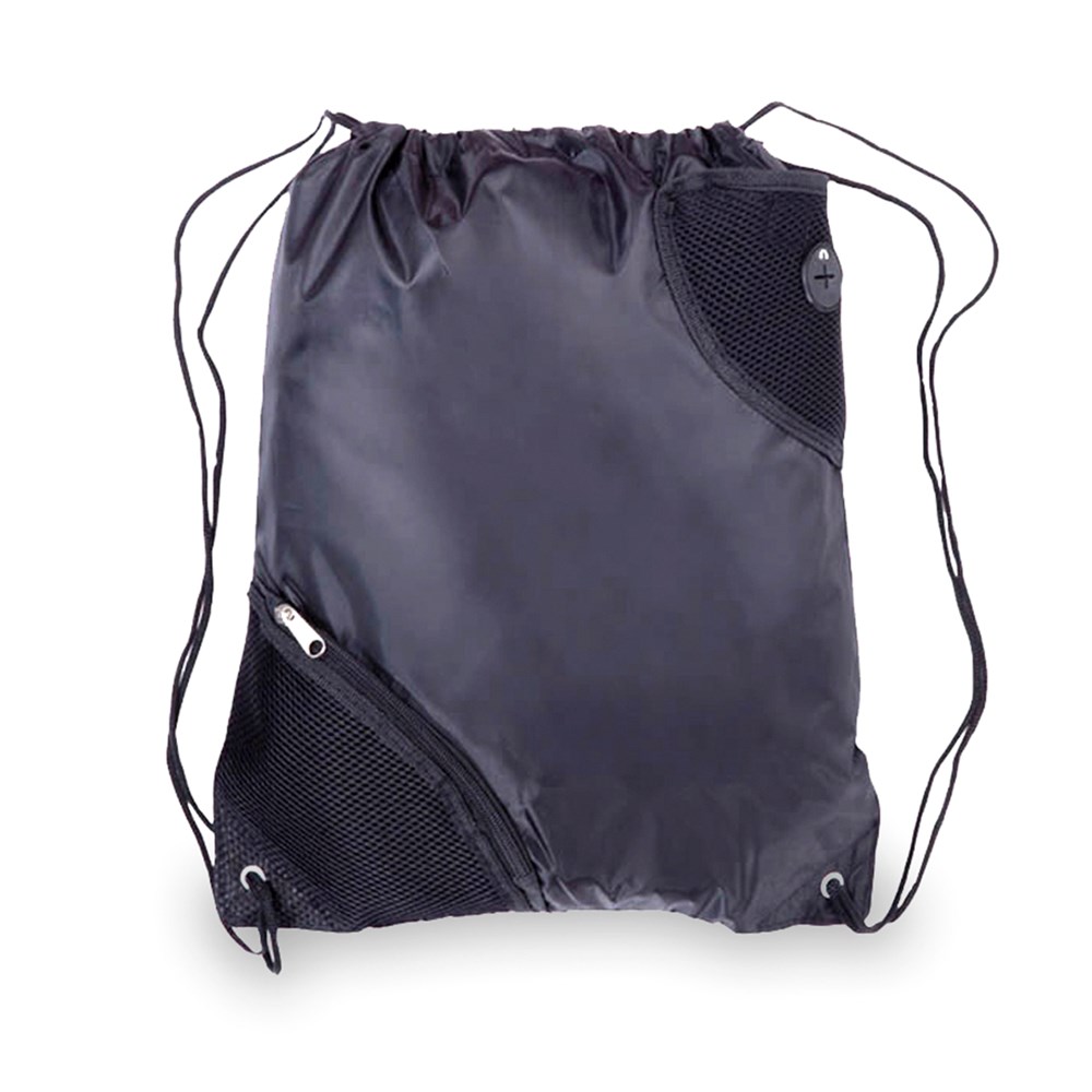 Rucksack mit Kordelzug aus weichem 210D Polyester in lebendigen Farben erhältlich, mit farblich passender Fronttasche mit Reißverschluss und Kopfhörerausgang. Zudem mit farblich passenden Netztaschen sowie mit Metallösen verstärkten Ecken und schwarzen Zugbändern.
