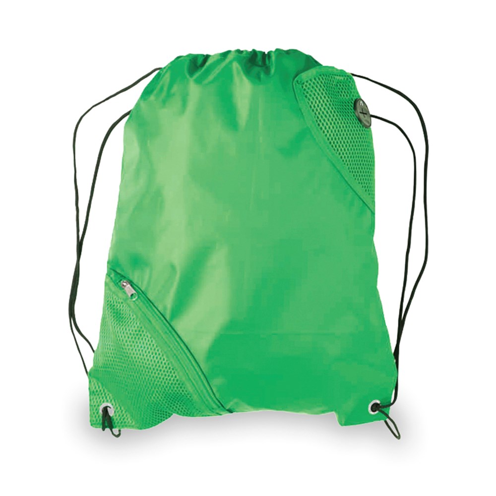 Rucksack mit Kordelzug aus weichem 210D Polyester in lebendigen Farben erhältlich, mit farblich passender Fronttasche mit Reißverschluss und Kopfhörerausgang. Zudem mit farblich passenden Netztaschen sowie mit Metallösen verstärkten Ecken und schwarzen Zugbändern.