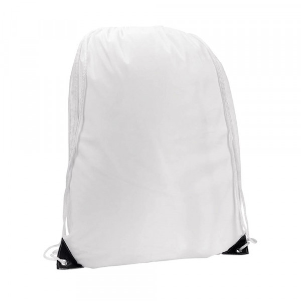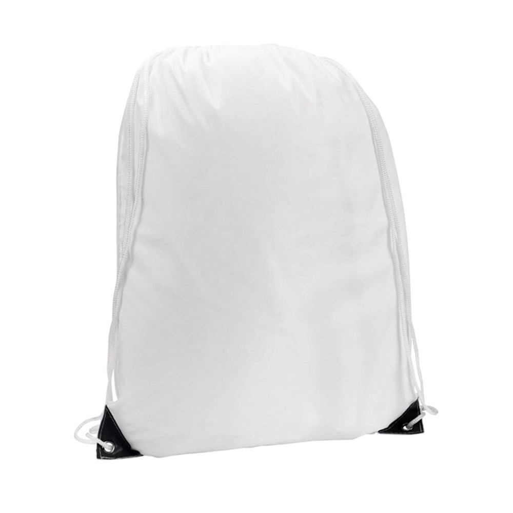Rucksack mit Kordelzug aus weichem 210T Polyester in Weiß mit Ecken in kräftigen Farben. Mit weißen Zugbändern und Ecken mit Metallösen und Kunstlederverstärkung. Speziell für den Sublimationsdruck entwickelt.