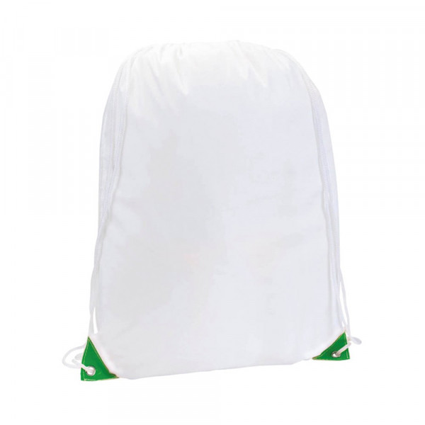 Rucksack mit Kordelzug aus weichem 210T Polyester in Weiß mit Ecken in kräftigen Farben. Mit weißen Zugbändern und Ecken mit Metallösen und Kunstlederverstärkung. Speziell für den Sublimationsdruck entwickelt.