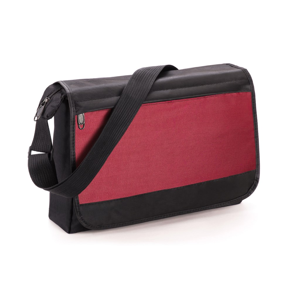 Originelle Schultertasche aus weichem 420D Polyester mit coolem, zweifarbigem Design in trendigen Farben. Mit Klettverschluss, Klappentasche mit Reißverschluss sowie verstellbaren Schultergurten und Zippern mit Stanzung für die Personalisierung mittels Doming / 3D Gel-Aufklebern.
